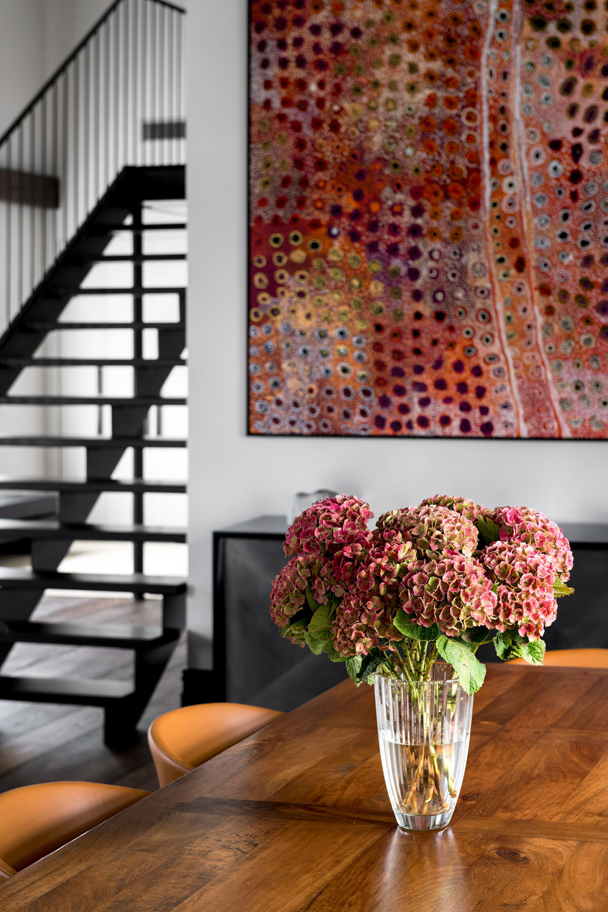 With high ceilings and an abundance of natural light, the opportunity to embrace a rich dark colour palette allowed for more intimately scaled spaces within the large industrial exterior. The fine cabinetry detailing creates a sense of lightness in a generally dark layered palette, and the soft pale furnishings enhance the colour and depth of the vibrant artworks.