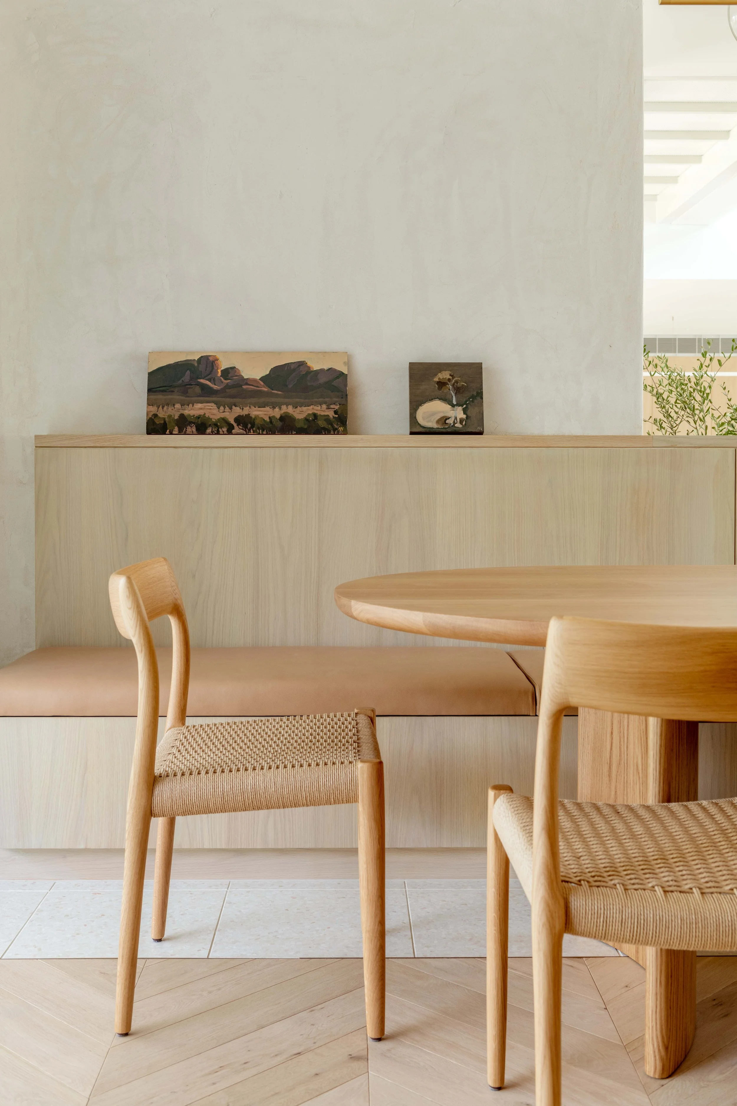 We brought together classic materials of paper-cord, leather, velvets, and linen with natural oak and brass to create sophisticated spaces, elevated by the curated collection of the client's artwork. The interplay of Australian and internationally sourced materials, furnishings and artistic elements creates a luxurious array of textures, colours, and shapes. This blend of elements results in an ambiance of enduring elegance and serene calm.